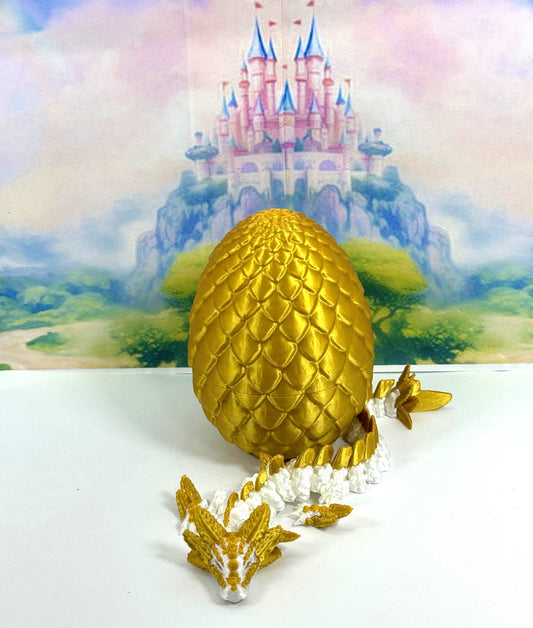 3D Printed Dragon with Dragon Egg, 8.25" Articulated Axolotl Dragon, White and Gold Axolotl Dragon, Fidget ADHD Autism Toy D042-GE