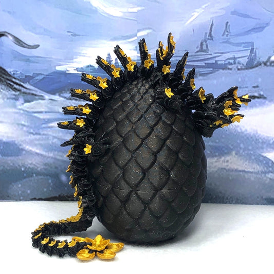 3D Printed Dragon with Dragon Egg, Articulated Dragon, 12" Black and Gold Cherry Blossom Dragon, Fidget Sensory Toy, Flexible ADHD, Autism, Relief Anxiety D043