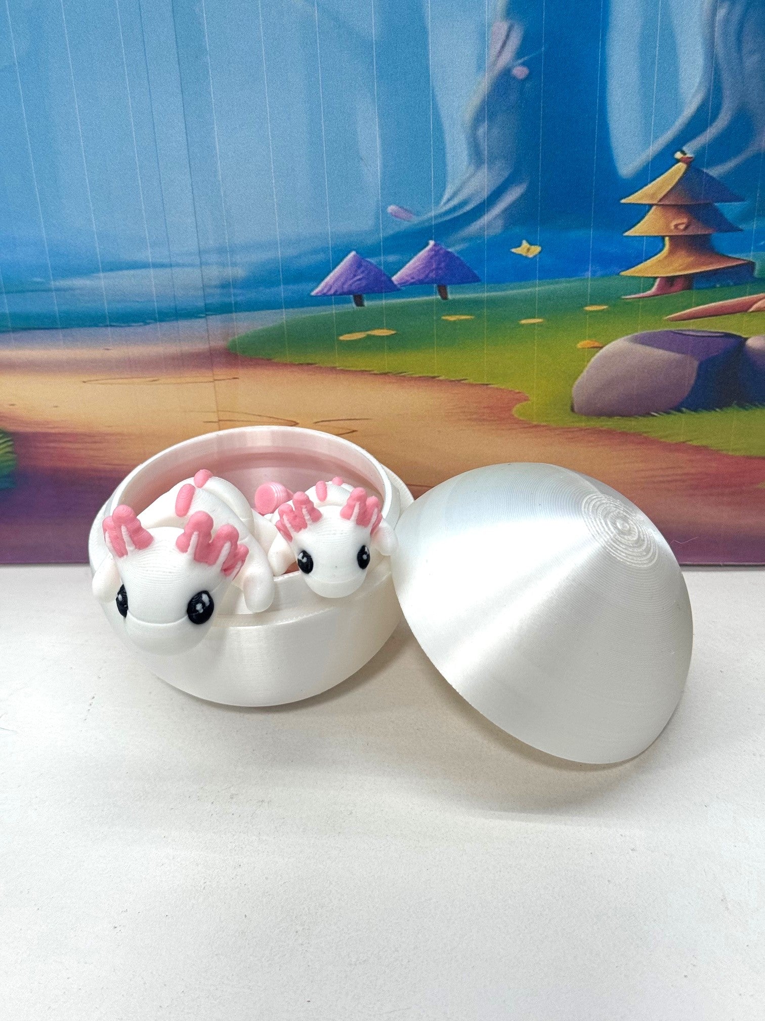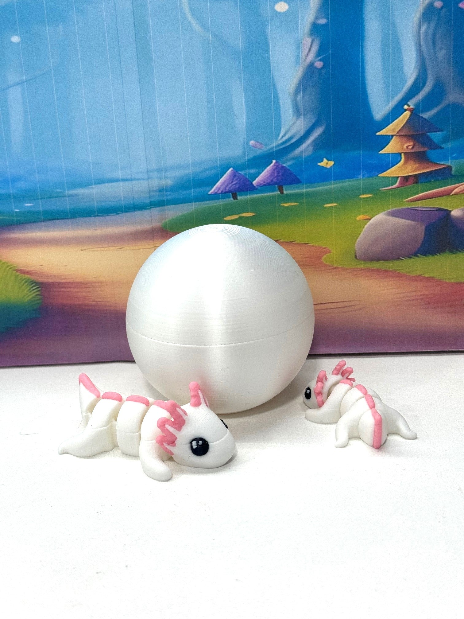 Introducing our 3D Printed ARTICULATED Mini Axolotl with Silky White Egg. The mini Axolotl measures 1.75" and the bigger one is 2.75" long. These 2pcs posable mini Axolotl are meticulously crafted with an eye for detail, this interactive desk accessory is not just a source of entertainment; it's also a stress-relieving toy and a chic decor piece for any space.